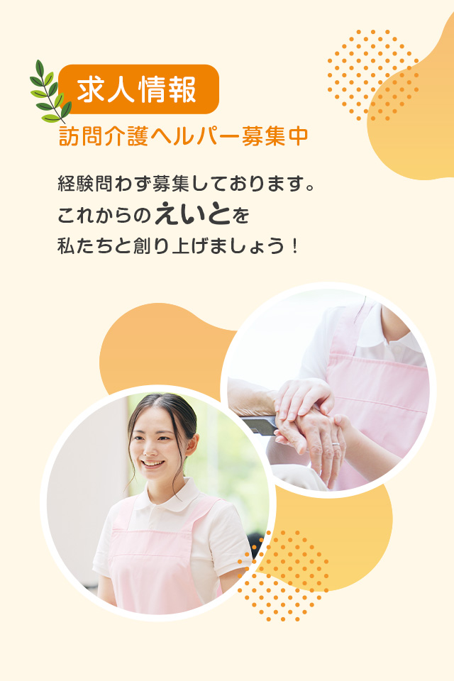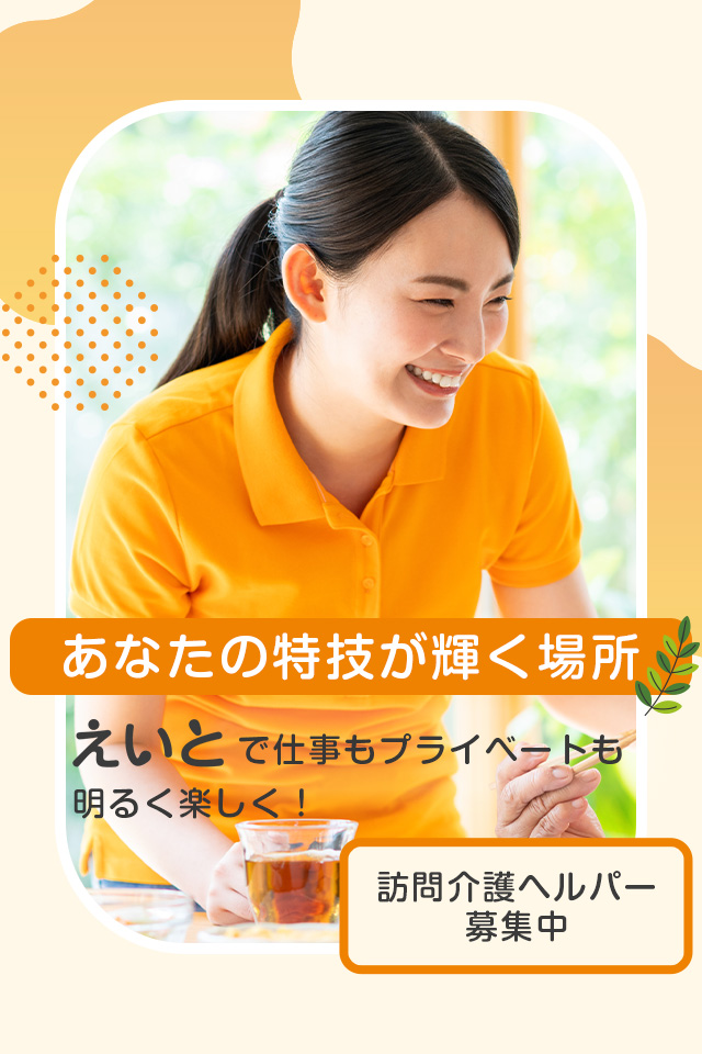 『訪問介護えいと』では、あなたのような熱意と才能を持った介護スタッフを求めています。私たちと一緒に、地域社会の一員として、利用者様一人ひとりの笑顔と幸福のために力を尽くしませんか? あなたの経験と情熱が、地域の高齢者や介護を必要とする方々の生活を支える大きな力となります